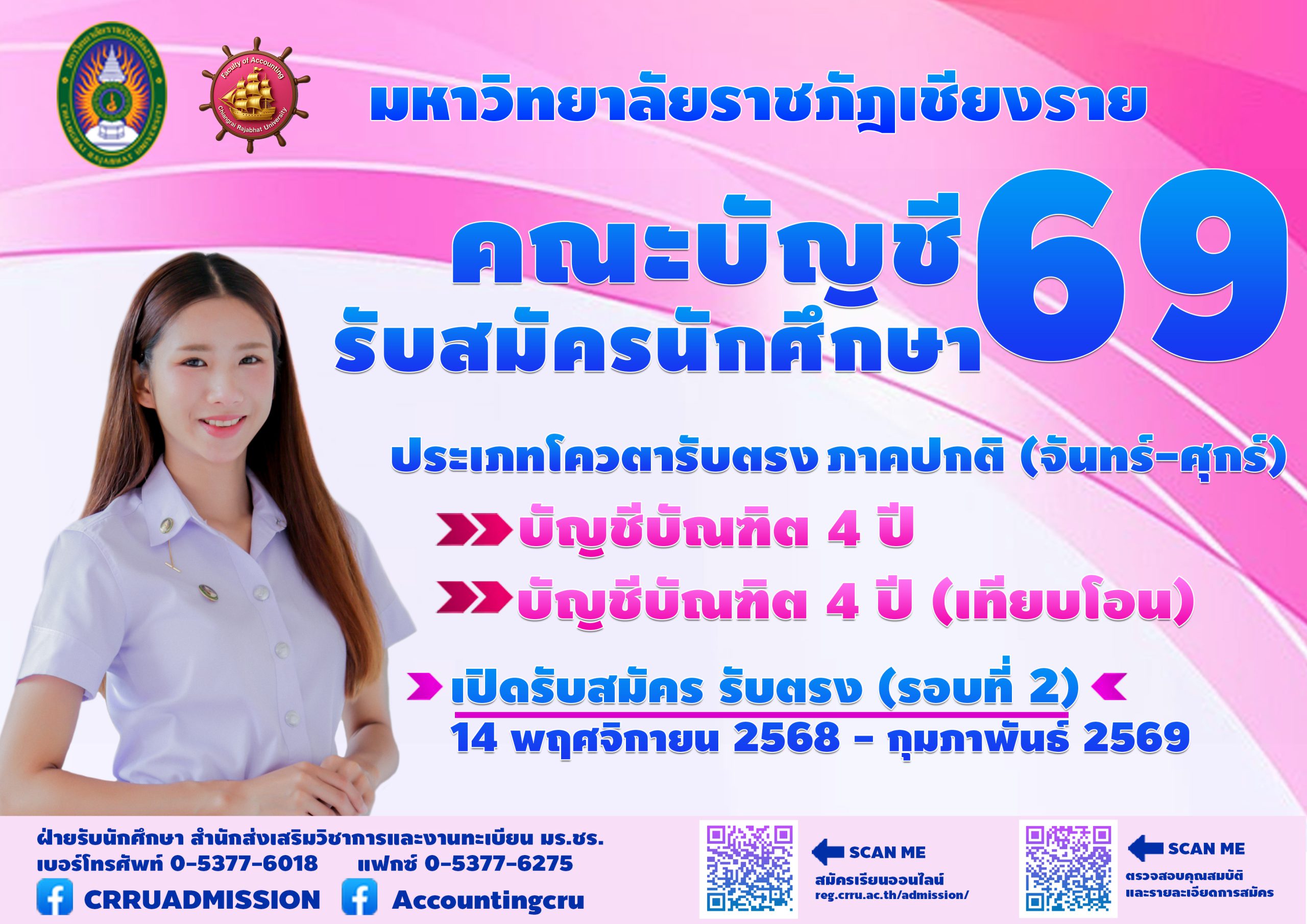 คณะบัญชี เปิดรับสมัครนักศึกษาหลักสูตรบัญชีบัณฑิต ปีการศึกษา 2569 By adminMarch 17, 2026March 17, 2026News คณะบัญชี มหาวิทยาลัยราชภัฏเชียงราย เปิดรับสมัครนักศึกษาปีการศึกษา 2569